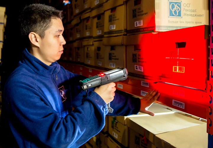 Курьеры наклеивают на каждый короб уникальный штрих-код, который сканируется на каждом этапе перемещения документов: при передаче документов сотруднику ОСГ, доставке в хранилище, перемещении документов на архивную обработку или сканировании и размещении на стеллажах. Таким образом, в каждый момент времени мы точно знаем, где находятся ваши документы.